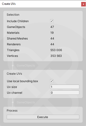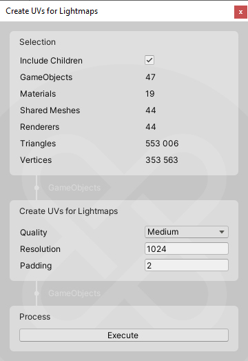 - Create Uvs for Lightmaps- This option will create UVs on the UV2 channel for use with lightmapping. The resolution and padding can be set in the menu.