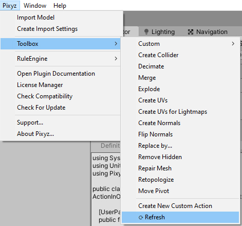 When you’re finished with your new script, click PiXYZ > Toolbox > Refresh to refresh the Toolbox menu. (The Toolbox does not refresh automatically.) If this doesn’t show your new script, you can edit the file manually to include it.