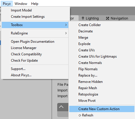 click PiXYZ > Toolbox > Create New Custom Action (Figure 08).