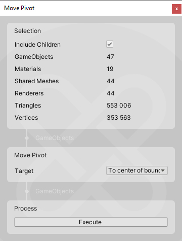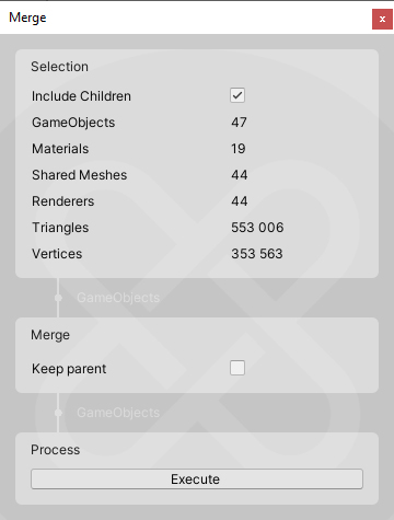 - Merge - Merges GameObjects together. 'All Together' will merge all input objects into a single object. 'With Children' will merge each with all of its own children (recursively). By merging, you will lose additional components such as Metadatas.