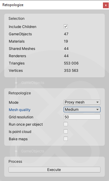 - Retopologize- Creates a remeshed version of the given mesh, following input topology. It is very useful for collisions or LODs or reducing meshes for use in devices with lower graphics capabilities.