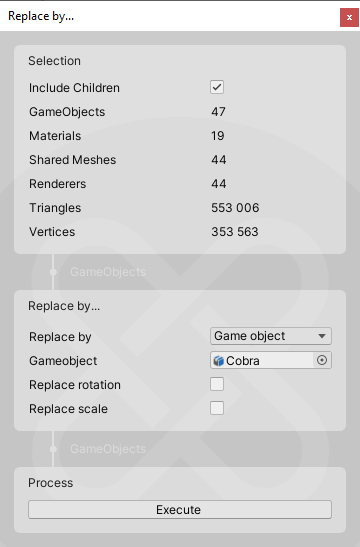 - Replace By…- Replace selected Game Objects with another Game Object. You can replace objects by a Bounding Box or by another Game Object.