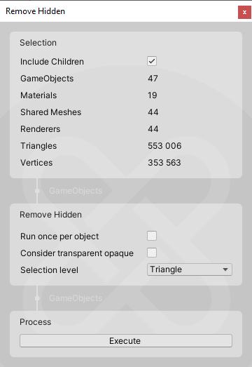 - Remove Hidden- This feature deletes Game Objects, Submeshes or Polygons not viewed from a sphere around the selection.