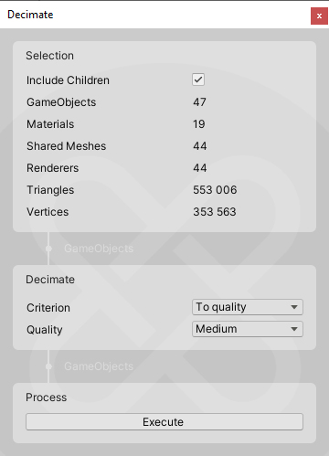 - Decimate - Reduces the number of polygons on the Meshes.