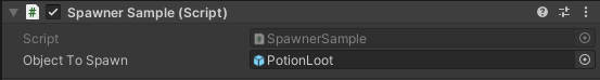 In the SpawnerSample script, the variable ObjectToSpawn is public. Let’s find it in the Unity Editor: