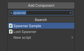 3. Make sure that MoneySpawner is still selected in the Hierarchy. In the Inspector, select the Add Component button. Search for Spawner Sample, and add the script to your MoneySpawner GameObject.