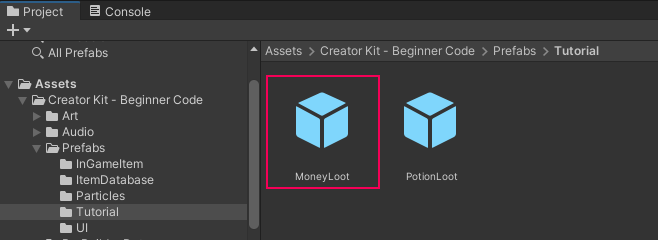 4. In the Project window, go to Assets/Creator Kit - Beginner Code/Prefabs/Tutorial and find the MoneyLoot Prefab.