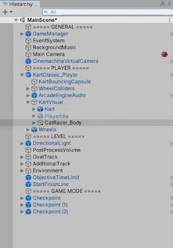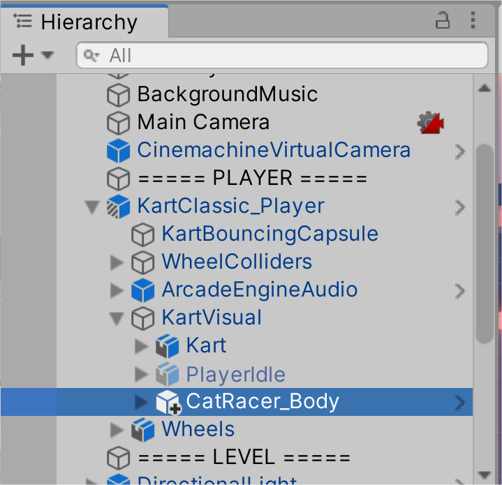 6. 계층 구조에서 'PlayerIdle'이 있는 'KartVisual' 아래에 'CatRacer_Body'를 드래그합니다. T-포즈를 취하고 있는 레이서의 모습이 나타납니다.