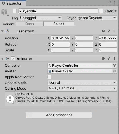 4. 'PlayerIdle'를 선택한 채로 인스펙터로 이동하고 체크박스를 선택 해제하여 'PlayerIdle' 게임 오브젝트를 비활성화합니다.