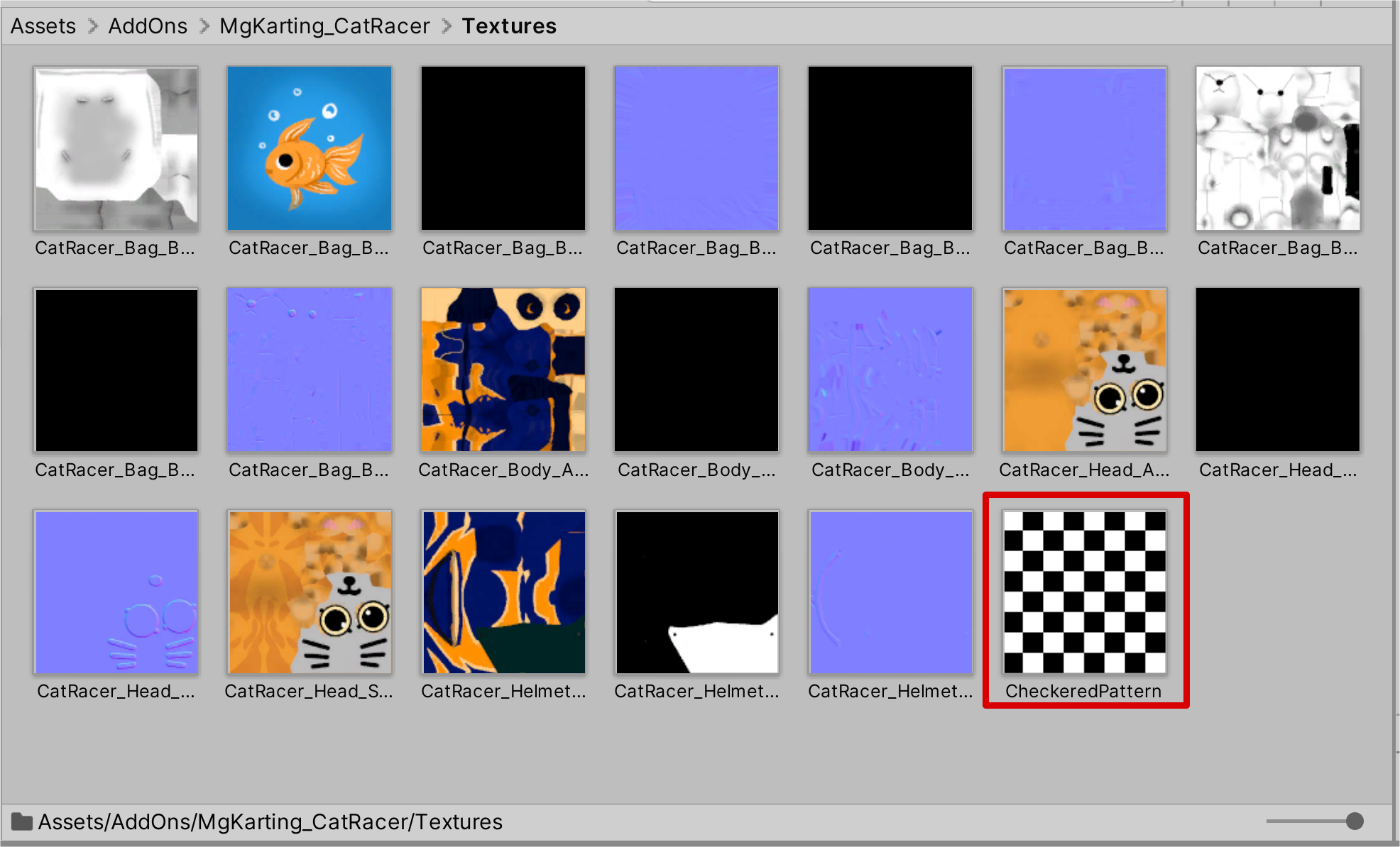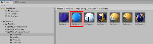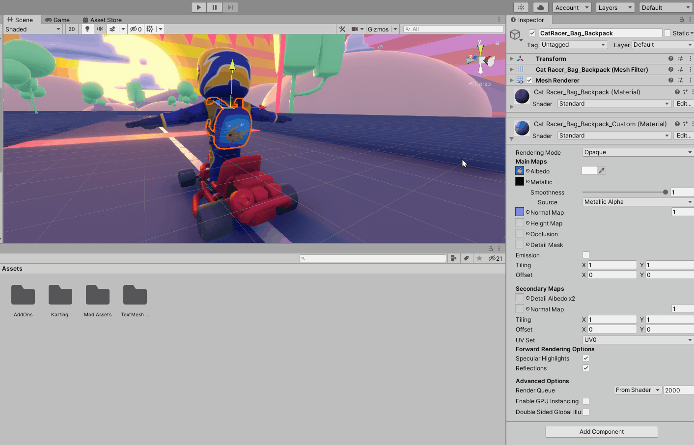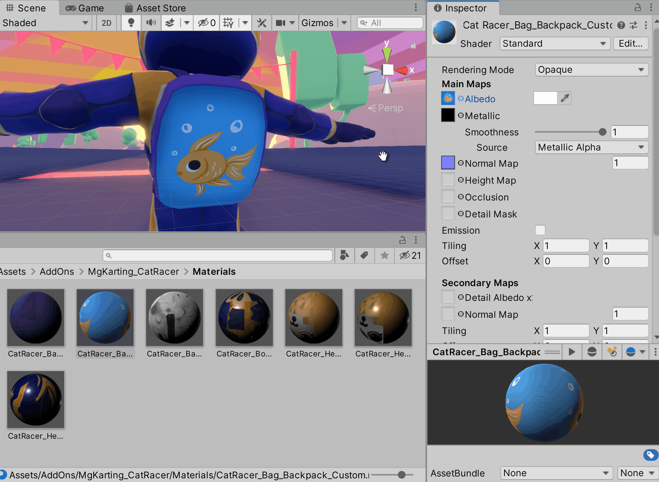 8. 이제 백팩의 'Materials' 폴더(Assets > AddOns > MgKarting_CatRacer > Materials)로 돌아가서 'CatRacer_Bag_Backpack_Custom' 머티리얼을 다시 선택합니다.