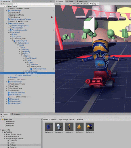 5. 'AddOn_Back'을 찾은 다음 MgKarting_CatRacer > Prefabs 폴더에서 'CatRacer_Bag_Bear'를 선택하여 'AddOn_Back' 위로 드래그합니다. 이제 'CatRacer_Bag_Backpack' 오브젝트를 삭제할 수 있습니다.
