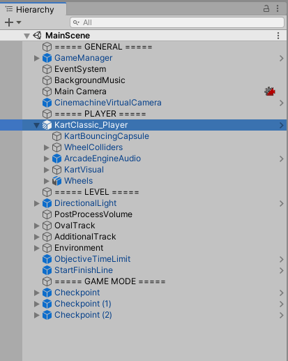 1. 먼저 계층 구조에서 카트 프리팹을 엽니다. 이번 모드의 메인 씬에서는 기본 카트를 사용하고 있지만 어떤 카트도 상관없습니다.