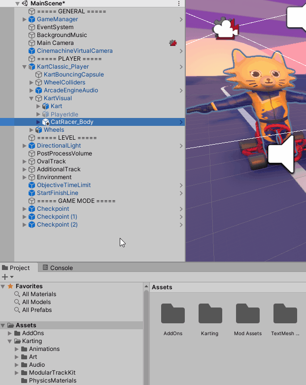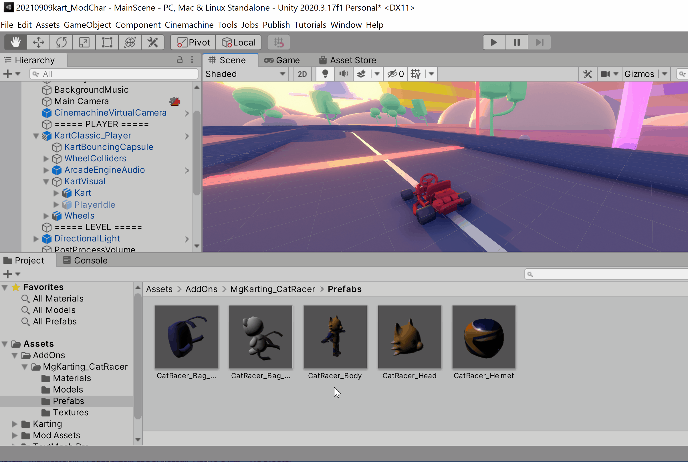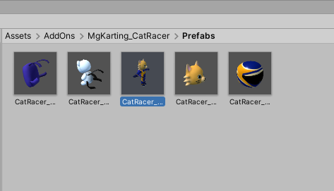 5. 'PlayerIdle' 대신 사용하고 싶은 캐릭터가 있는 폴더로 이동합니다. 이 모드에서는 CatRacer를 한번 사용해 보겠습니다. AddOns > MgKarting_CatRacer > Prefabs로 이동합니다. 'CatRacer_Body'라는 프리팹을 확인할 수 있습니다.