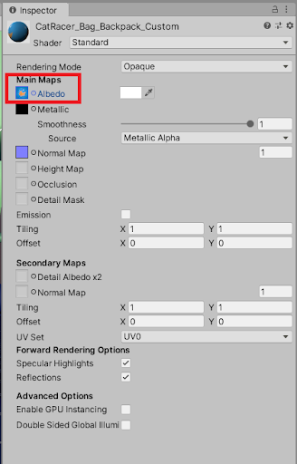 3. 머티리얼을 선택하여 인스펙터에 나타나게 합니다. Main Maps에서 Albedo 파라미터를 확인합니다. 머티리얼의 Albedo는 백팩에 나타나는 이미지에 해당합니다.