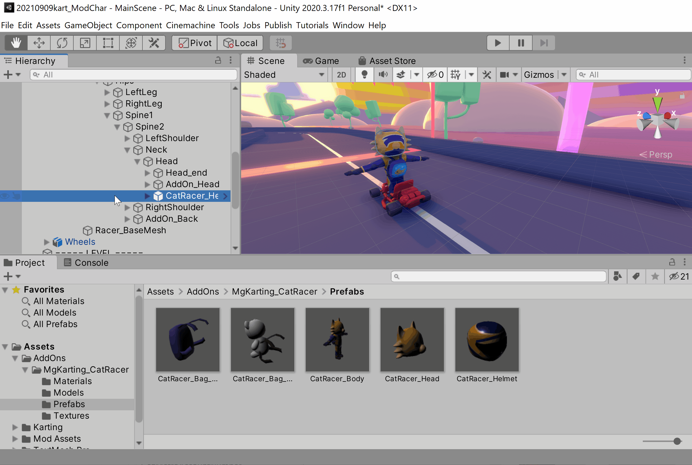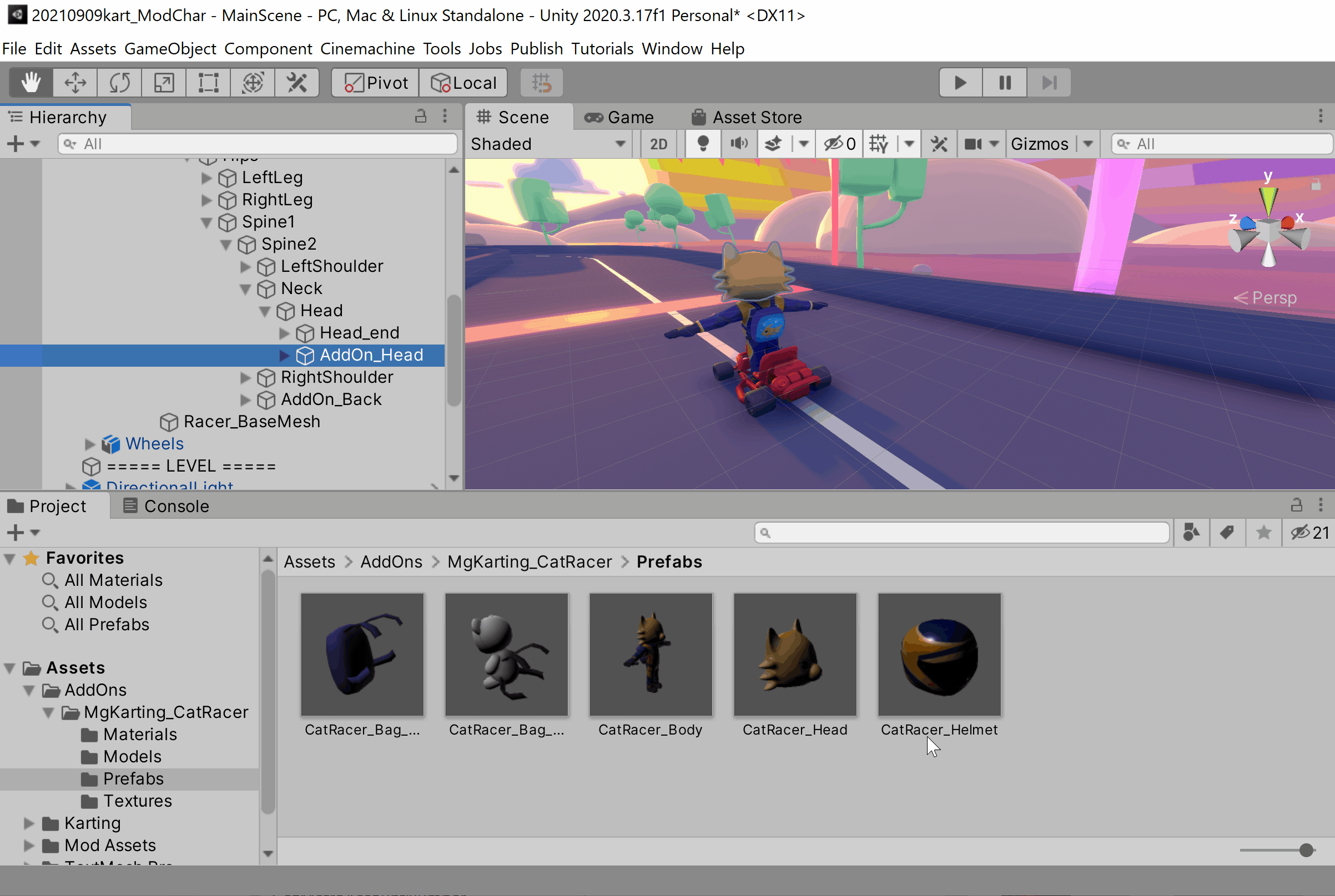 3. 'MgKarting_CatRacer' 폴더(Assets > AddOns > MgKarting_CatRacer > Prefabs)에 있는 'CatRacer_Helmet'을 선택하여 'AddOn_Head'에 드래그합니다.