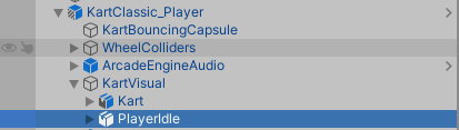 2. 계층 구조에서 'KartClassic_Player' 프리팹 내의 'PlayerIdle' 게임 오브젝트를 찾아 선택합니다. 'KartClassic_Player' 게임 오브젝트를 확장하여 KartClassic_Player > KartVisual > PlayerIdle로 이동하거나 검색 기능을 사용합니다.