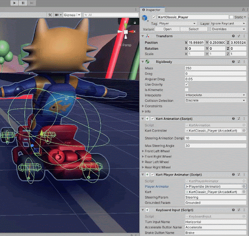 캐릭터에 올바른 애니메이션을 실행하려면 계층 구조의 'KartClassic_Player'로 이동하여 Kart Player Animator 컴포넌트를 찾습니다. 현재의 'Player Animation' 파라미터에서 'PlayerIdle (Animator)'를 'CatRacer_Body (Animator)'로 교체합니다.