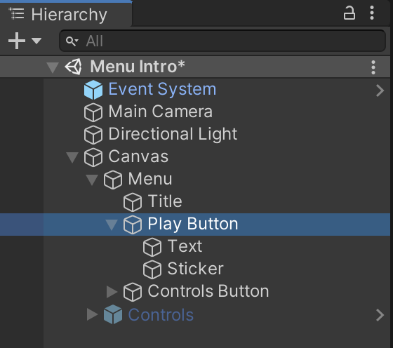 1. Hierarchy ビューまたは Scene ビューで、「Play Button」ゲームオブジェクトを選択します。