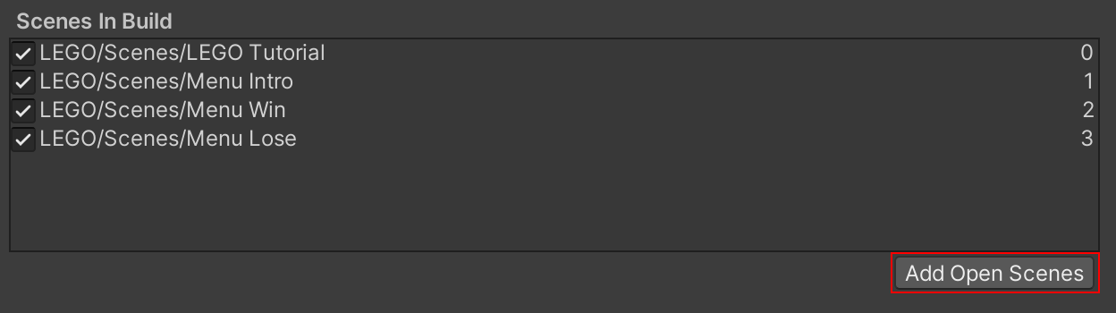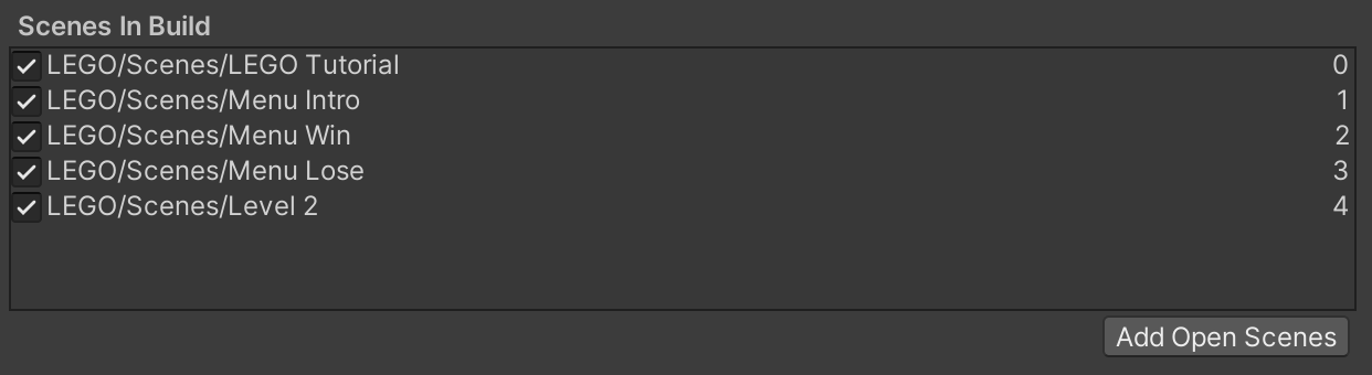 プロジェクトをビルドして再生した時に、最初に読み込まれるシーンは、「Menu Intro」シーンです。次に、カスタマイズした再生可能なシーンが読み込まれます。ここでは「LEGO Tutorial」が読み込まれます。シーンに設定された勝利または敗北条件が満たされると、対応するメニューシーンが読み込まれます。