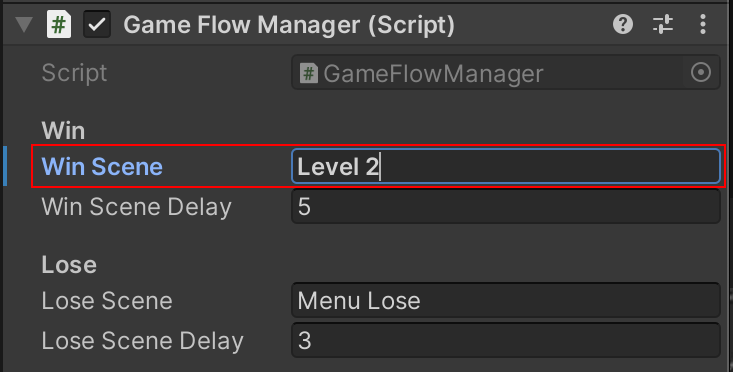 6. Win Scene プロパティのテキスト入力欄を「Level 2」に変更します。