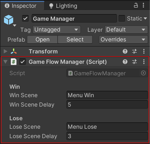 2. インスペクターで、Game Flow Manager コンポーネントを探します。