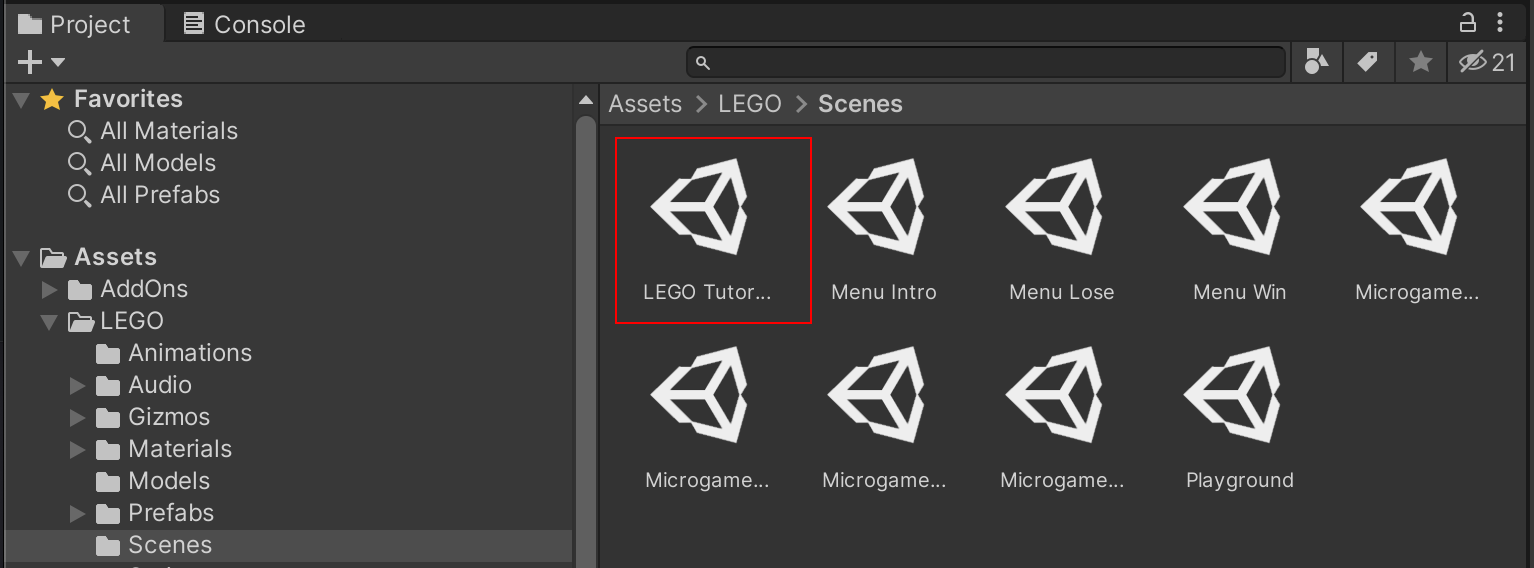 1. Project ウィンドウで、「LEGO Tutorial」シーンを選択します。