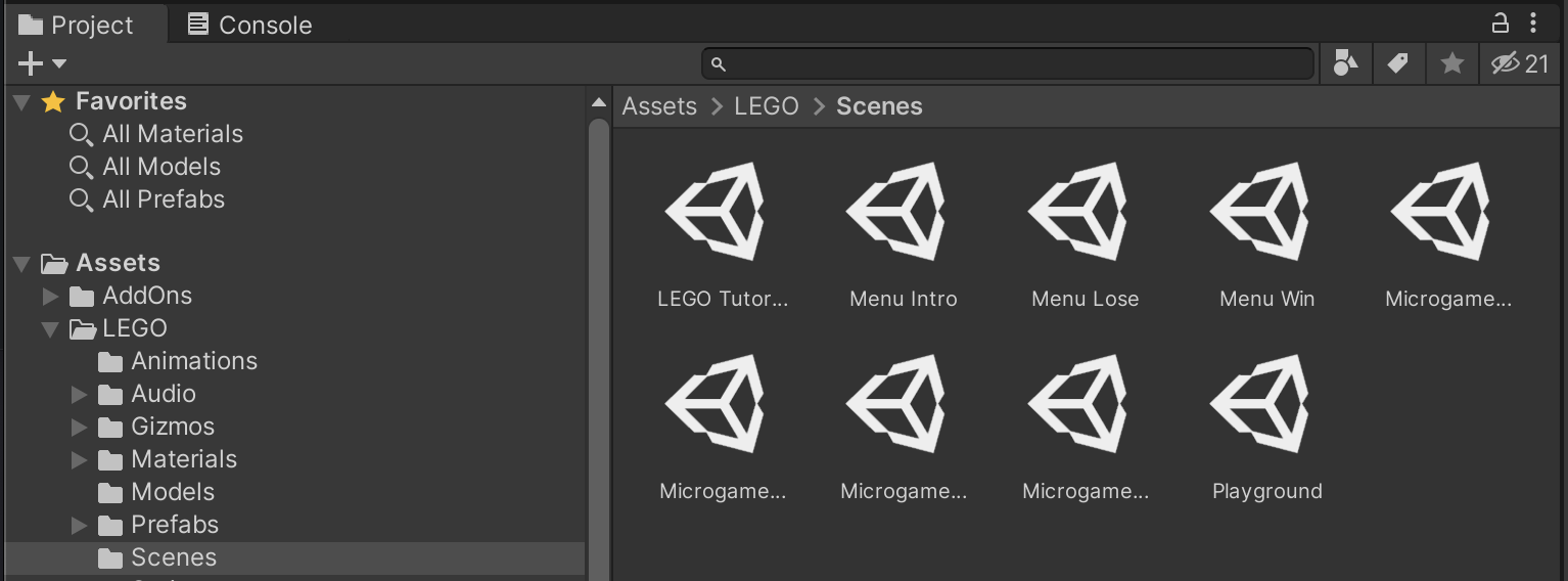 3. Project ウィンドウで、Assets > LEGO > Scenes と移動します。