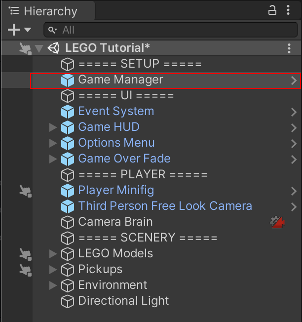 1. Hierarchy ビューで、「Game Manager」ゲームオブジェクトを探して選択します。