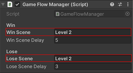 4. Win Scene と Lose Scene のプロパティを「Level 2」に変更します。