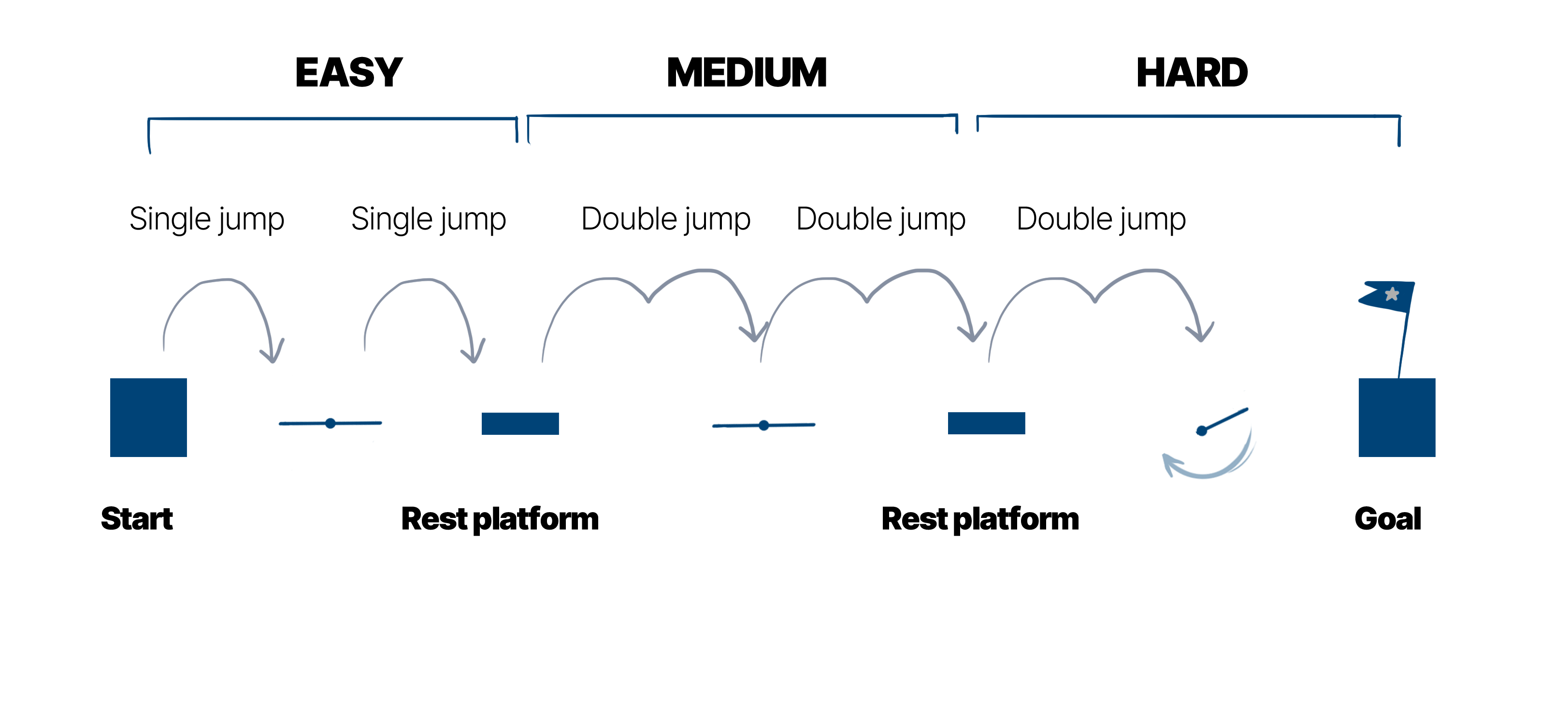 Level 2 の作業を始める前に、レベルデザインの基本的な原則について見てみましょう。具体的な文脈を追加するために、プレイヤーが障害物のあるコースを進むステージを作成するという単純な例を考えてみましょう。