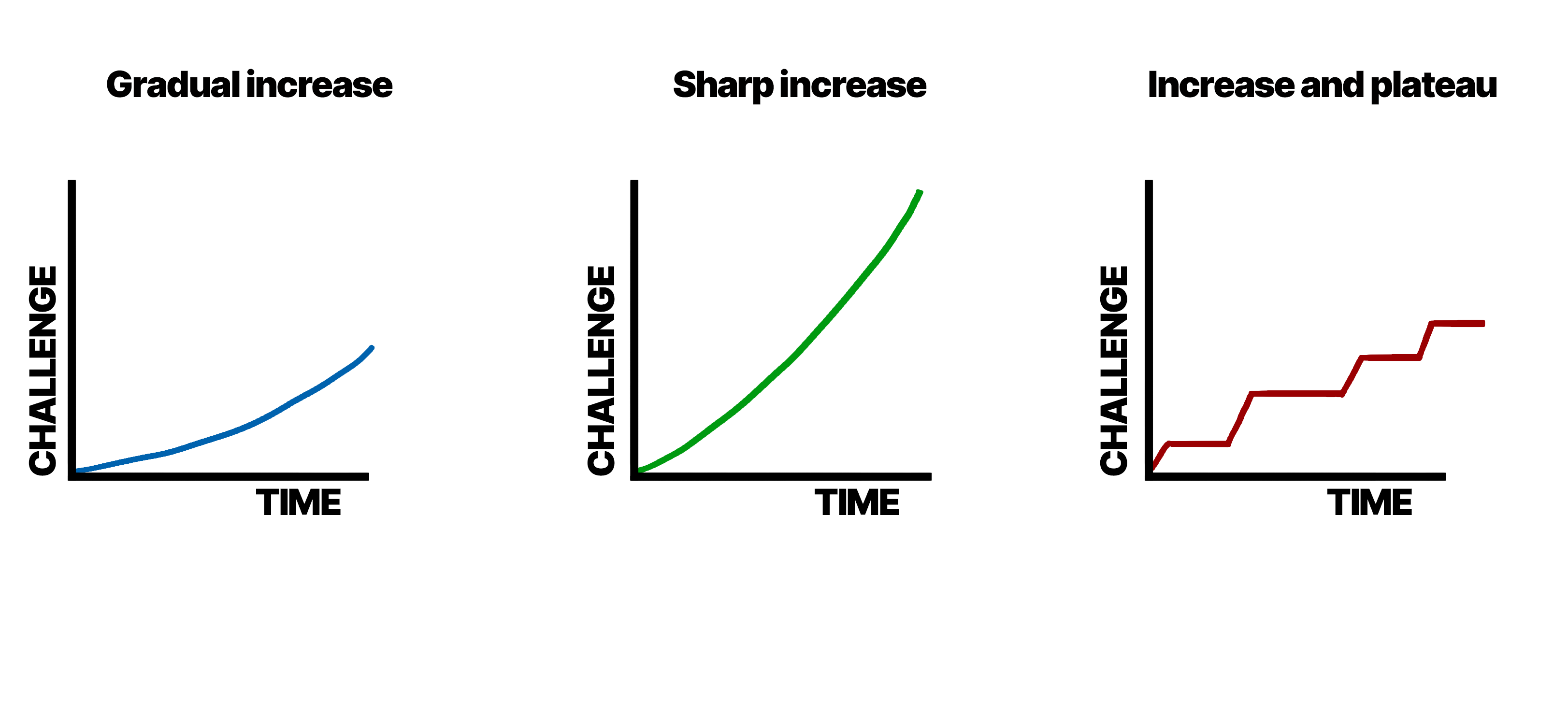 上に示した、緩やかな上昇を示す例、急激な上昇を示す例、上昇と踊り場が交互に現れる例は、こうした概念に初めて触れる方のために、難易度曲線を簡略化したものです。プレイヤーへの課題についてもっと知りたいと思った方は、このような話題についてまとめた資料がたくさんあるはずですので、探してみてください。