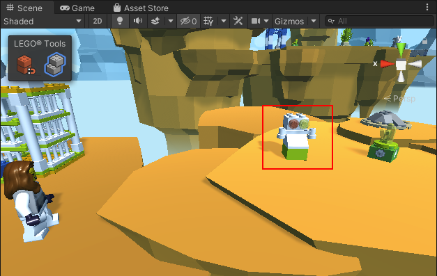2. 「Console」を選択して、シーンビューにドラッグします。LEGO® Tools で、Brick Building を無効にします(左のアイコンをチェック)。次に、移動ツール(W キー)を使って、ゲームのスタート地点の近くにコンピューター端末を置き、回転ツール(E キー)を使って、向きを調整します(機能するようになったら、ゲーム中の好きな位置に端末を置くことができます)。
