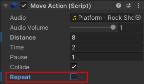 4. Repeat プロパティを無効に(チェックボックスをオフに)します。これで、ドアは一度だけ動くようになります。