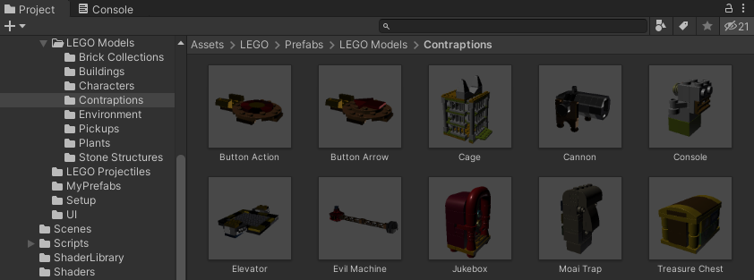 1. Project ウィンドウで、Assets > LEGO > Prefabs > LEGO Models > Contraptions と移動します。