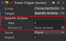 目前,Target 属性设置为 Connected Actions。这意味着触发器将激活连接到控制台(连接位置)的所有动作积木。控制台没有连接任何动作积木,实际上,您需要在这里使用此 Touch Trigger 来激活笼子门上的行为积木。