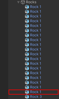 3.展开“Rocks”游戏对象并选择列表中最后一个“Rock 1”游戏对象。