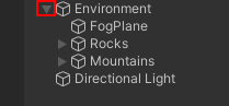 游戏对象可以按父子层级视图进行组织,因此您可以对游戏对象进行分组和组织。此处,Environment 的所有子项分别为“FogPlane”、“Rocks”、“Clouds”和“Mountains”。