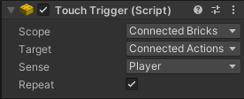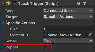 注意:如果您不小心选择了“Move”游戏对象,则不会再在 Inspector 中看到 Touch Trigger (Script) 组件。如果出现这种情况,请在 Hierarchy 中选择“Touch Trigger”游戏对象,然后重试。