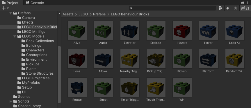 您可以在 Project 窗口中导航到 Assets > LEGO > Prefabs > LEGO Behaviour Bricks 来查找行为积木。