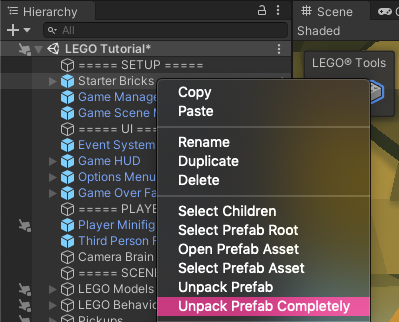 2.右键单击“Starter Bricks”游戏对象,然后从上下文菜单中选择 Unpack Prefab Completely。立方体图标将不再是蓝色。