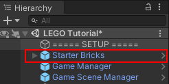 1. 在 Hierarchy 中,找到“Starter Bricks”游戏对象。蓝色立方体图标表示这是预制件的实例。