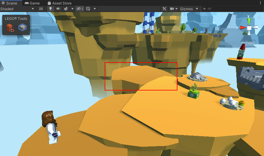 2. 在 Scene 视图中,找到一个构建敌人的位置。关卡起点左侧的岩石区域是构建敌人的好位置。如果目前这里放置了 Galo Bird,则可以将它移开或选择其他区域来构建敌人。