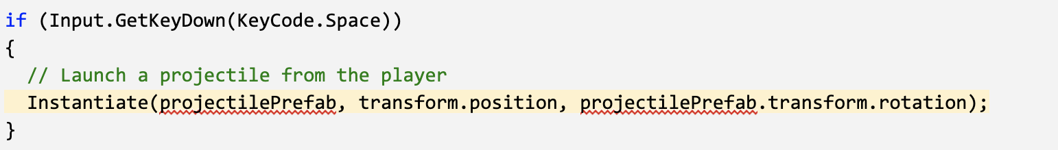 if (Input.GetKeyDown(KeyCode.Space)) { - Inside the if-statement, add a comment saying that you should // Launch a projectile from the player