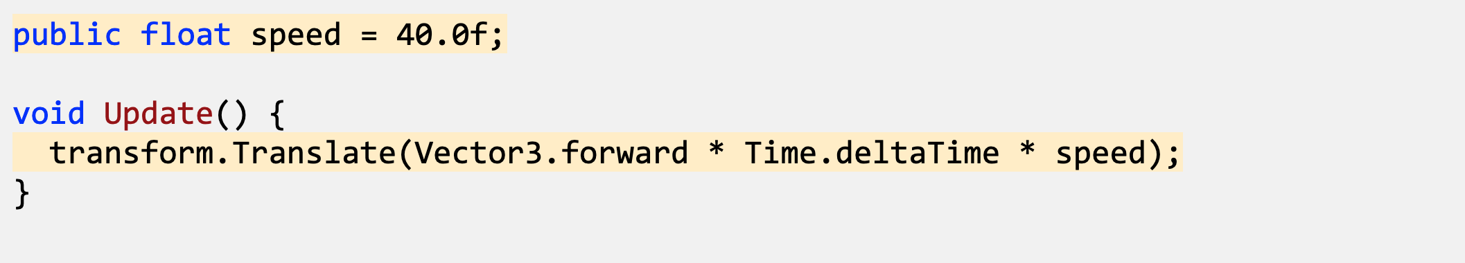 - In Update(), add transform.Translate(Vector3.forward * Time.deltaTime * speed);, then save