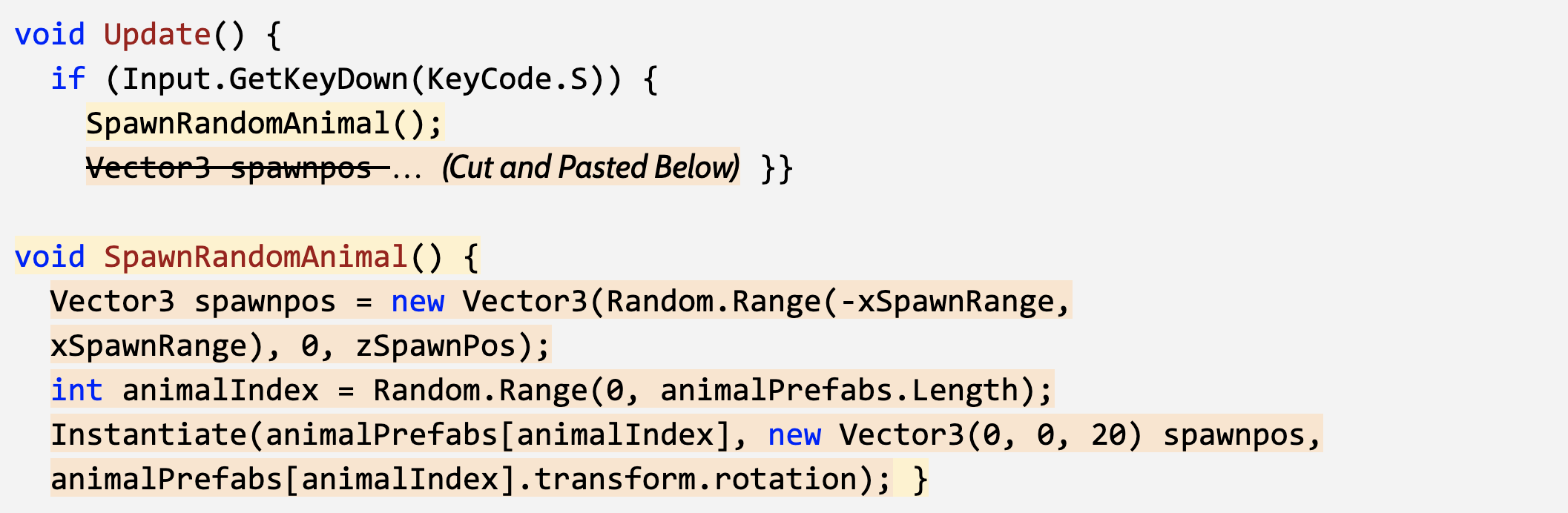 1. In SpawnManager.cs, create a new void SpawnRandomAnimal() {} function beneath Update()