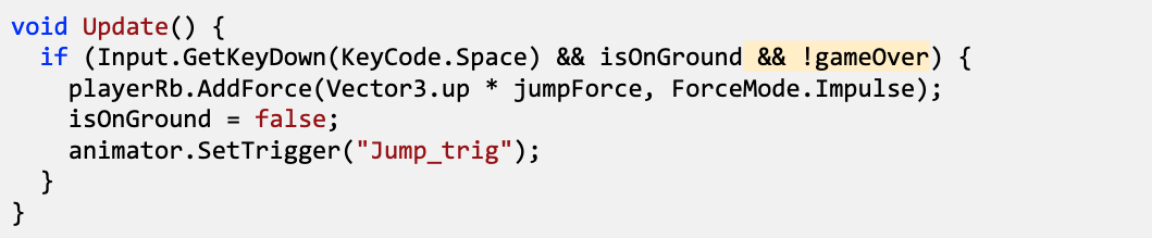 - To prevent the player from jumping while unconscious, add && !gameOver to the jump condition