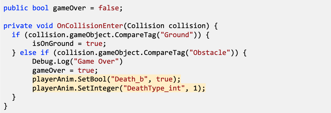 - In the condition that player collides with Obstacle, set the Death bool to true