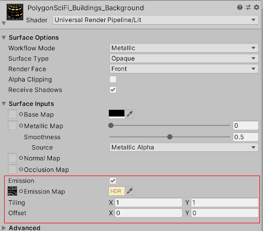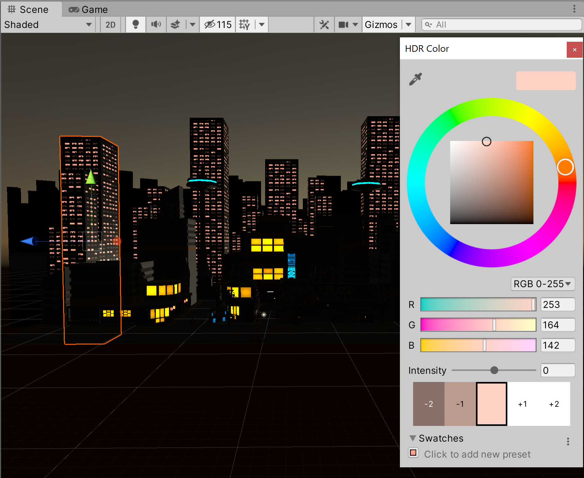 Last is the Emissive Color property. Currently it’s set to yellow, which is why the windows emit a yellow tint. Let's change the color.