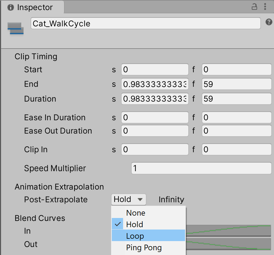 1. Select the Cat_WalkCycle Animation Clip in the Timeline. In the Inspector, you will see the default value for the Post-Extrapolate setting is Hold, which means that when the clip is done, Unity will hold the final pose forever. Choose Loop from the drop-down to update the Post-Extrapolate setting for the Animation Clip (Figure 11).