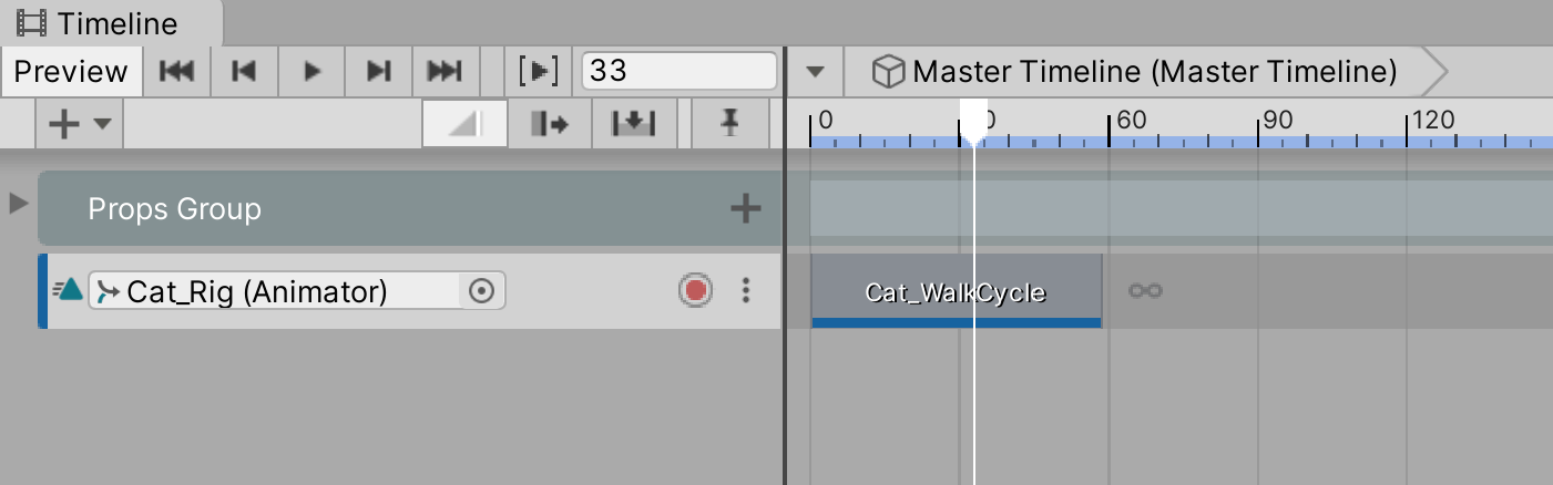 If you scrub the Timeline now, you’ll see the cat move forward while playing the animation, but the animation stops halfway through at Frame 59, the end of the Cat_WalkCycle Animation Clip that we added previously.